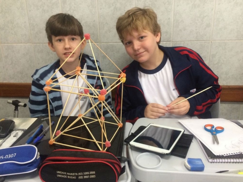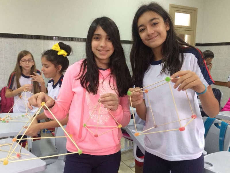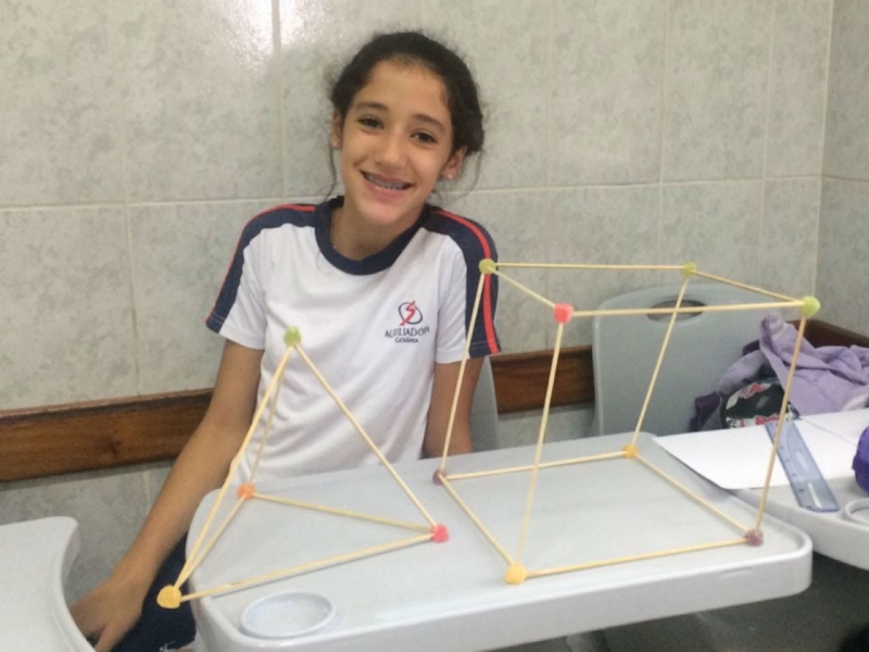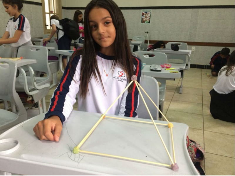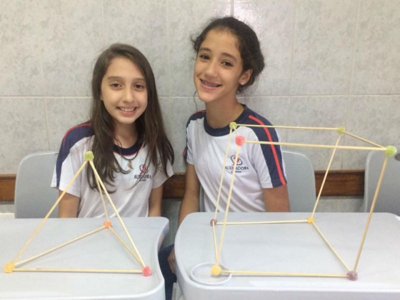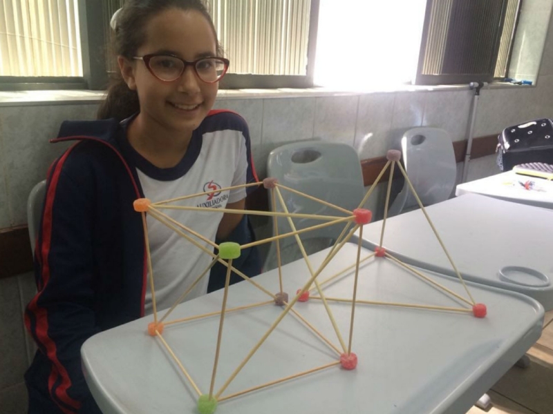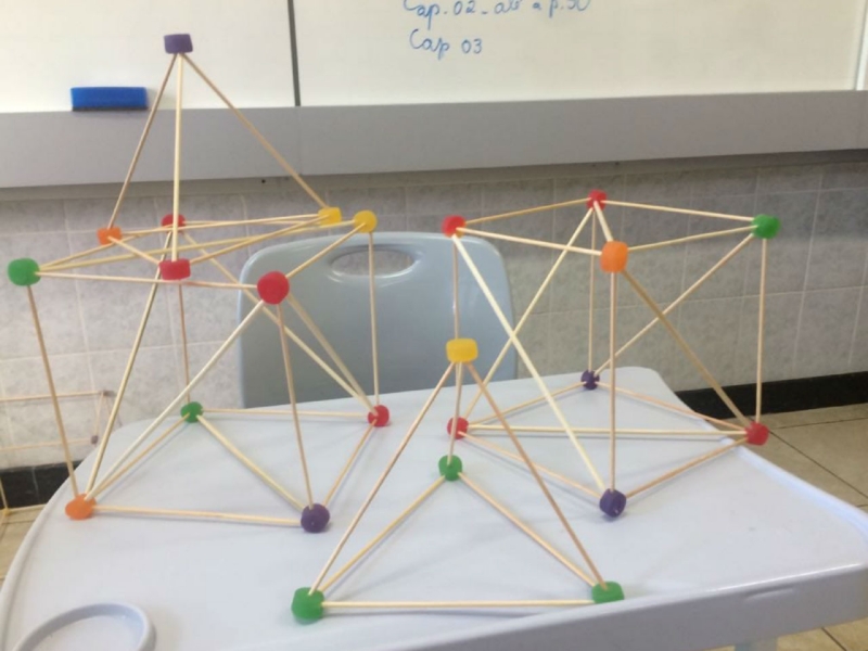 A Professora de Matemática do 6º ano, Sônia Vieira, utilizou atividades lúdicas, escolhendo a técnica com balas de jujuba e palitos de churrasco na construção de esqueletos de poliedros, de modo que as balas representam os vértices e palitos, as arestas. A construção de poliedros se torna fácil e rápida, facilitando seu uso na própria sala durante as aulas. Além disso, o material é de baixo custo e de fácil acesso.