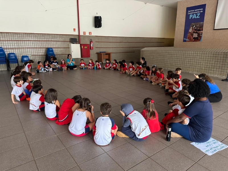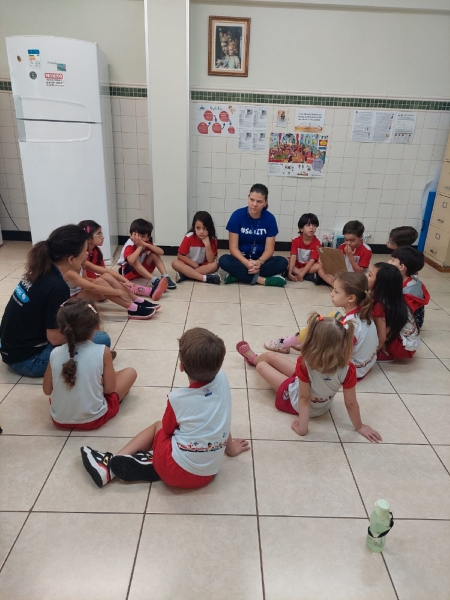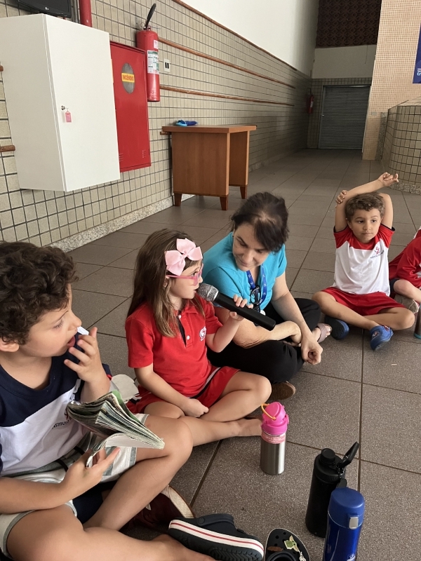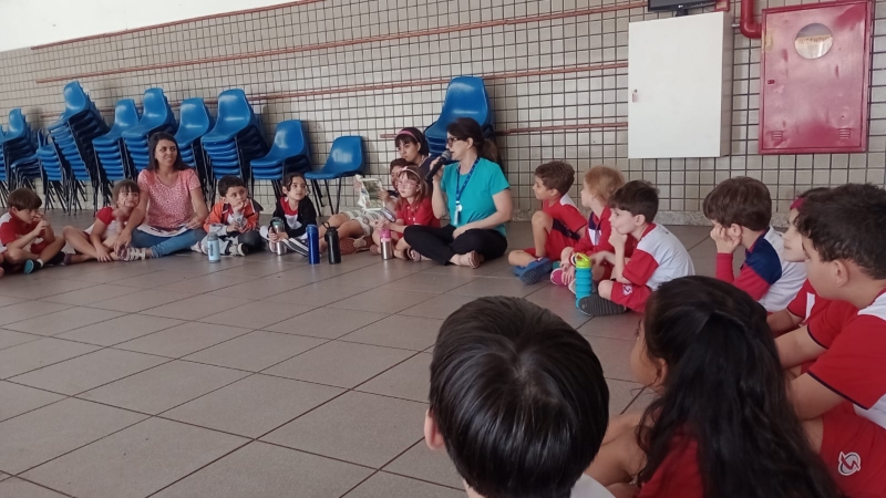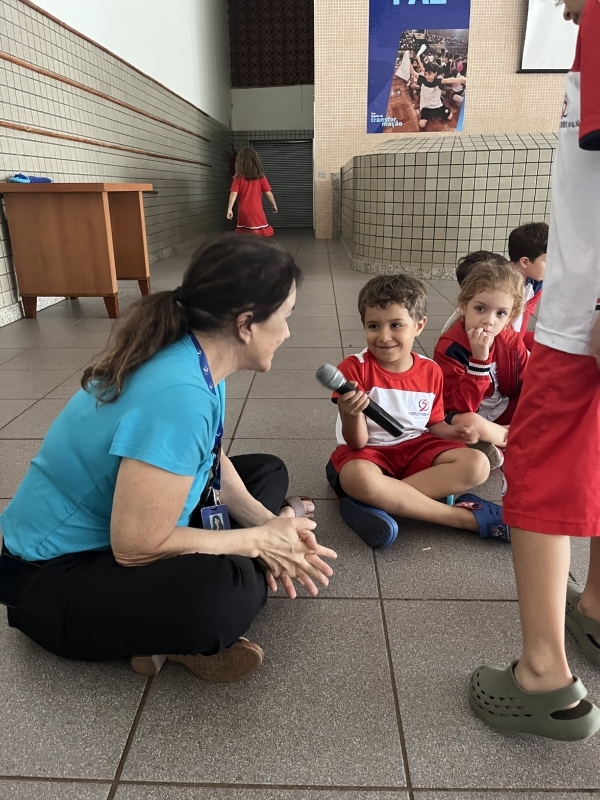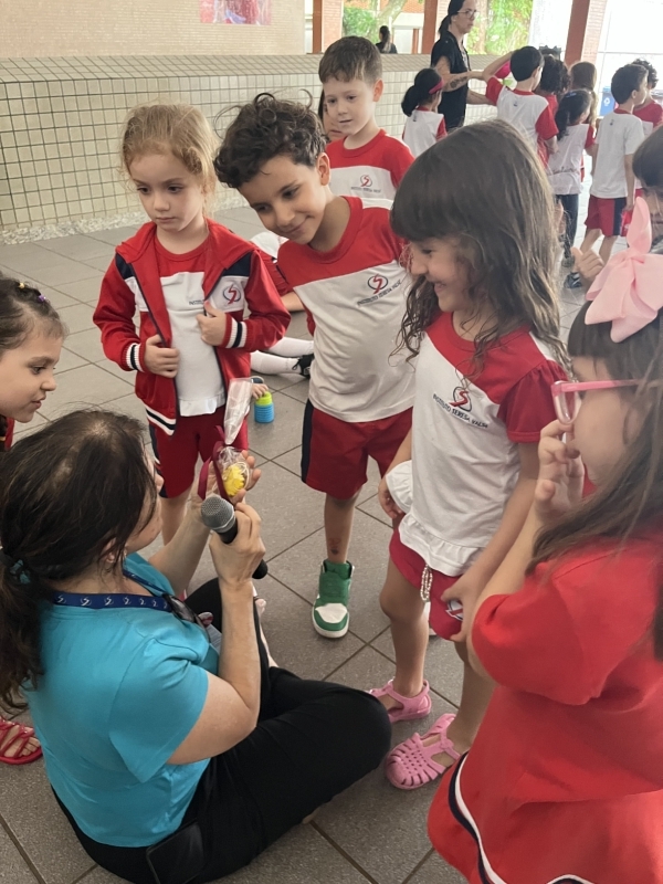 Todas as curiosidades foram respondidas com muito carinho pela coordenadora. Por fim, as crianças agradeceram e entregaram uma lembrança. Foi um momento rico de partilhas e aprendizado.