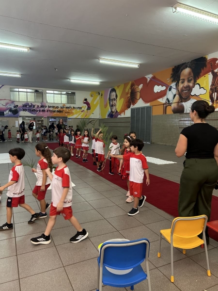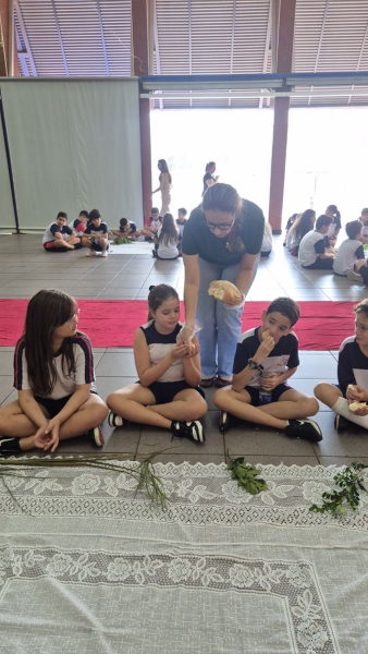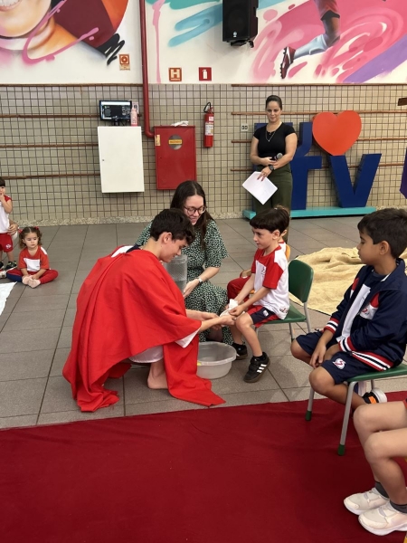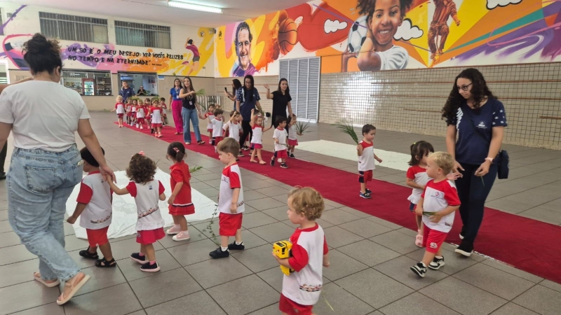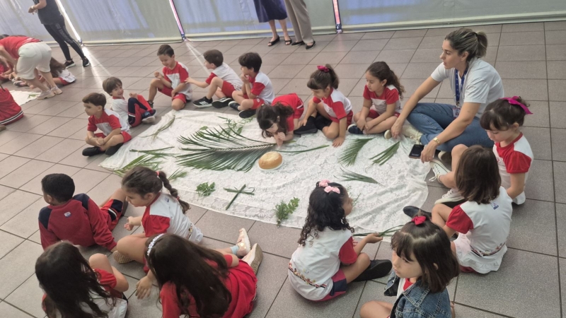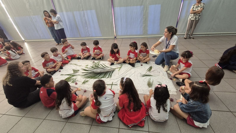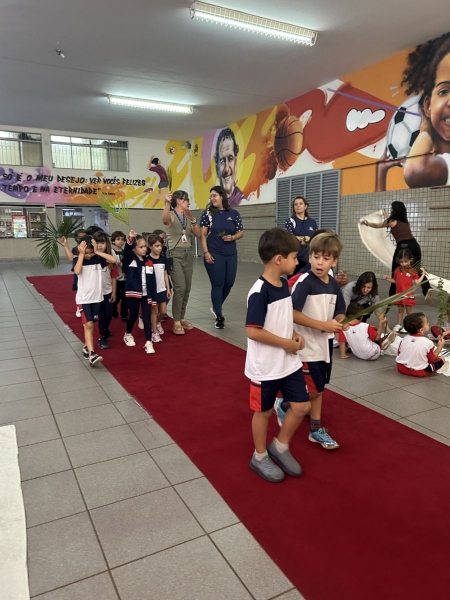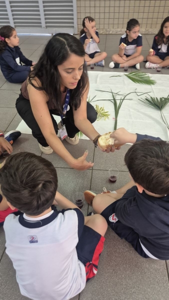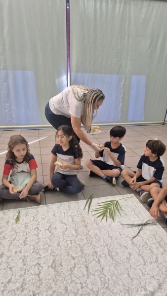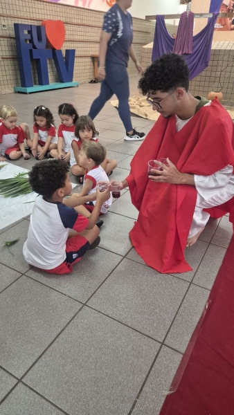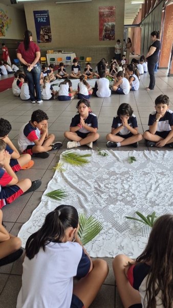 A programação teve início na segunda-feira (30), com encontros voltados à Educação Infantil e aos estudantes dos 1º anos. No período da manhã, as crianças participaram de uma vivência na área coberta da escola, marcada por momentos de oração, escuta e gestos simbólicos que ajudaram a apresentar, de maneira lúdica, o significado da Semana Santa.