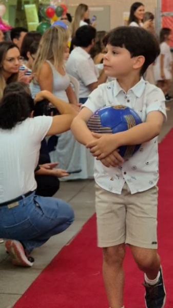 Dando sequência ao momento, as crianças cantaram a música em inglês This Little Light of Mine, que trouxe a mensagem de deixar a luz de Jesus brilhar em cada um de nós. Em seguida, vivenciamos um dos momentos mais simbólicos da noite com a música Sem Perceber, escolhida para representar o tempo que passa, transforma e nos prepara para novos voos. Na sequência, cada criança recebeu seu Caderno de Memórias do Infantil, sendo acolhida pelos aplausos, gestos de orgulho e abraços de suas famílias.