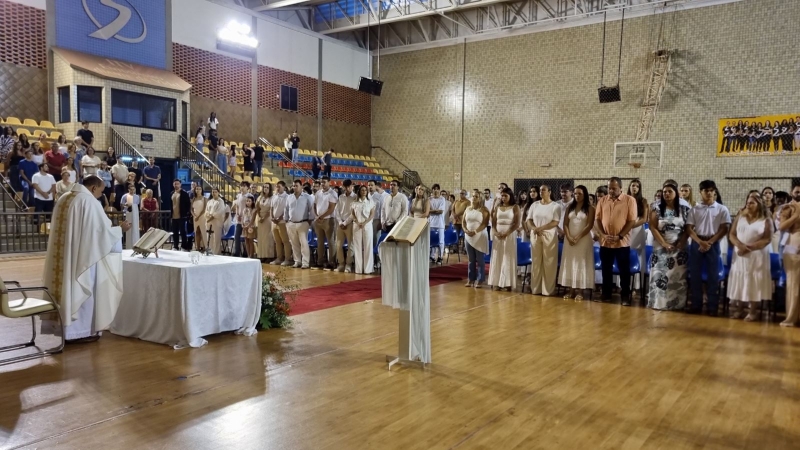 Presidida pelo Pe. Anchieta, a Celebração Eucarística contou com a participação ativa dos formandos, que colaboraram nas leituras e no momento do ofertório, tornando a celebração ainda mais significativa.
