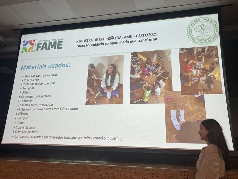 Na tarde do dia 03 de novembro, participamos da Mostra de Extensão da Faculdade de Medicina. Tivemos a alegria de fazer parte, semanalmente, das atividades oferecidas pelo Projeto de Extensão, executado com tanto carinho pelos acadêmicos de Medicina. Eles sempre nos acolhem com atenção e trabalham temas que ampliam conhecimentos, proporcionando momentos de alegria e ludicidade.