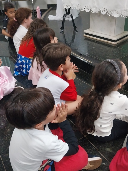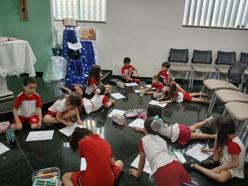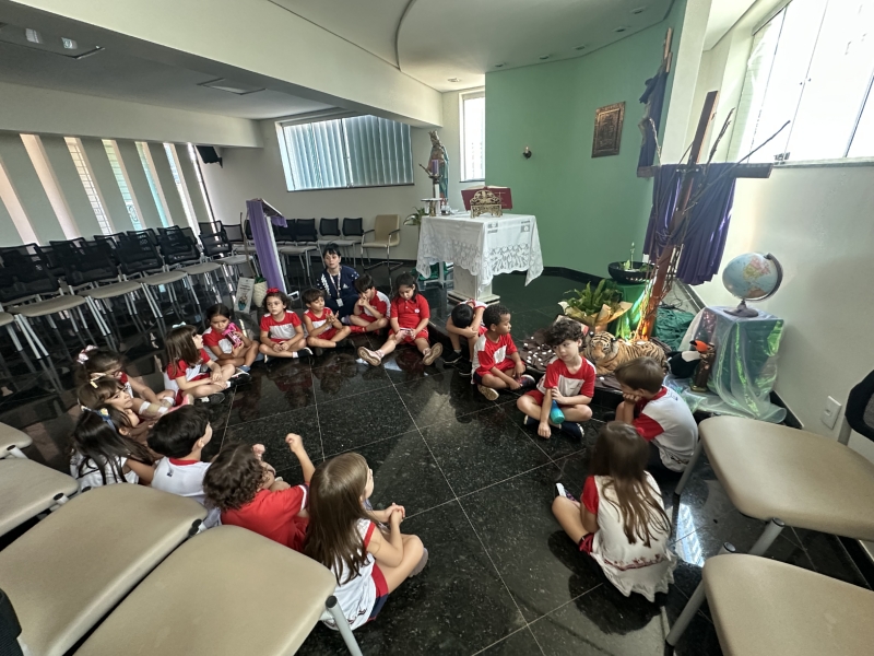 As crianças do Infantil 3, assim como as demais turmas, vivenciam semanalmente momentos na capela, onde aprendem sobre o amor de Deus, rezam, cantam e refletem de forma lúdica e significativa. Esses encontros ajudam a cultivar valores como gratidão, solidariedade, respeito e amor ao próximo.