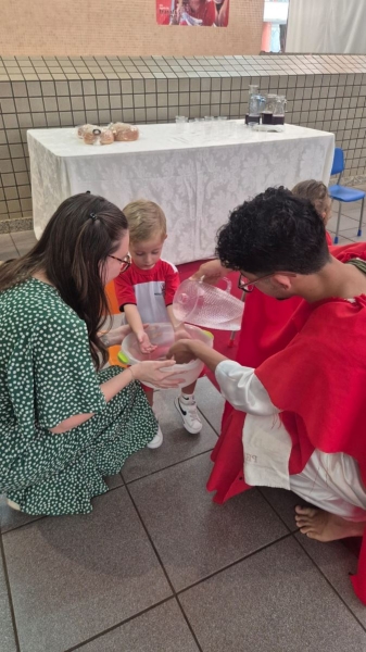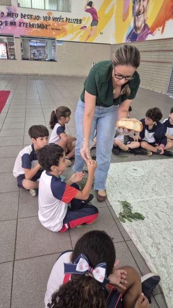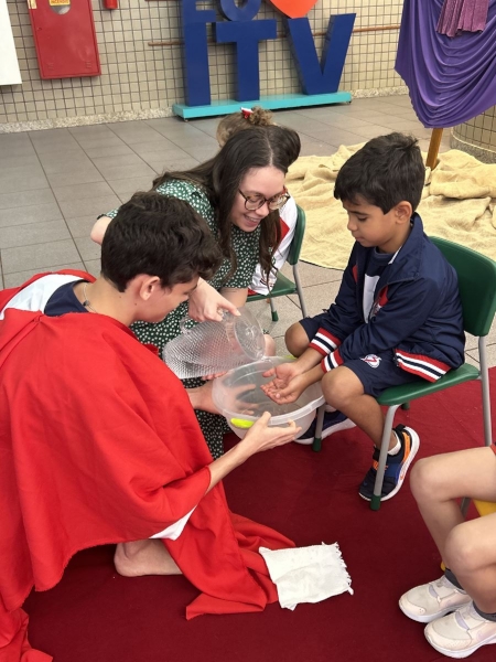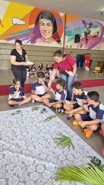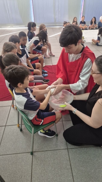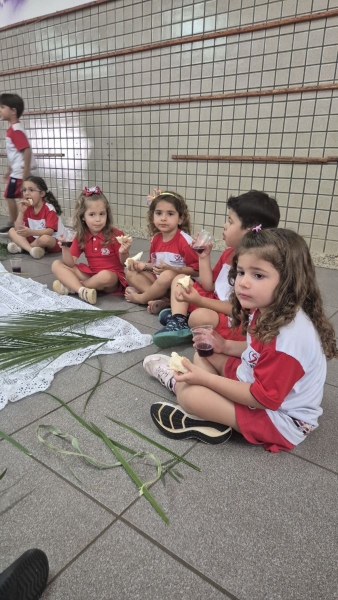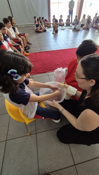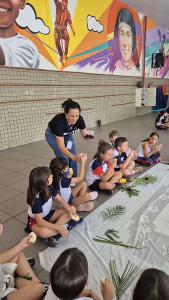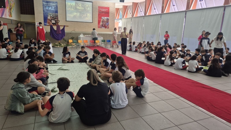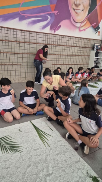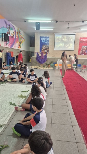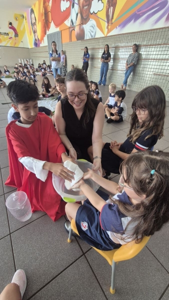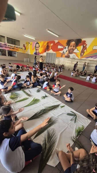 A programação teve início na segunda-feira (30), com encontros voltados à Educação Infantil e aos estudantes dos 1º anos. No período da manhã, as crianças participaram de uma vivência na área coberta da escola, marcada por momentos de oração, escuta e gestos simbólicos que ajudaram a apresentar, de maneira lúdica, o significado da Semana Santa.
