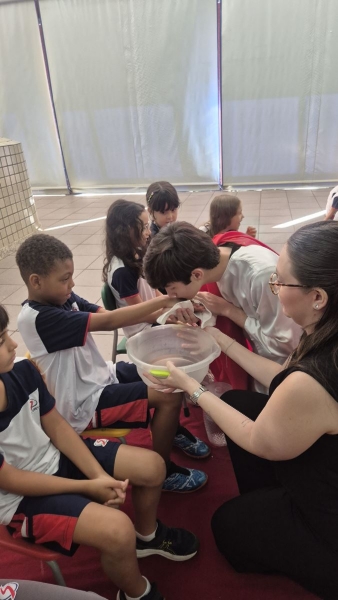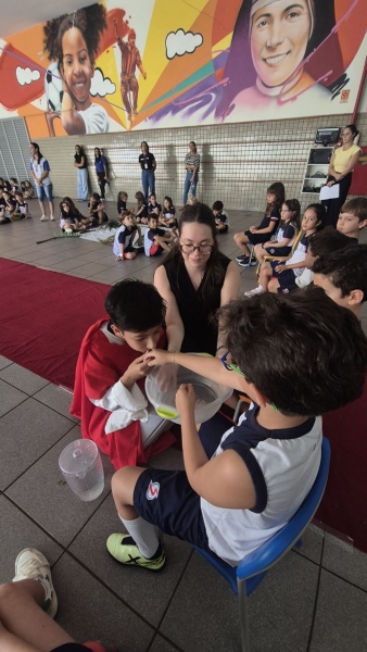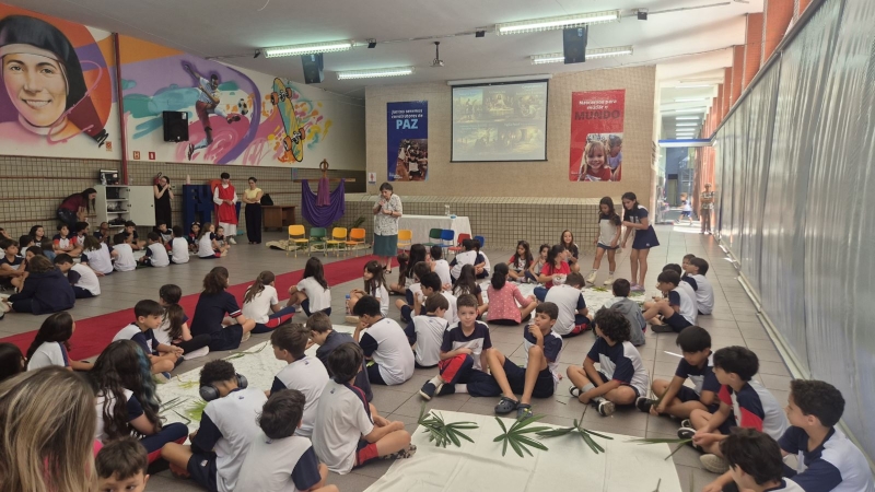 Na terça-feira (31), foi a vez dos estudantes do Ensino Fundamental I aprofundarem a reflexão. Pela manhã, as turmas dos 2º e 3º anos participaram do encontro, que teve continuidade ao longo do período. À tarde, as vivências envolveram os alunos dos 1º, 2º, 3º, 4º e 5º anos, reunidos na área coberta da escola.