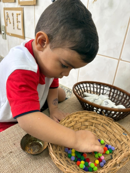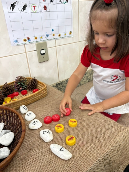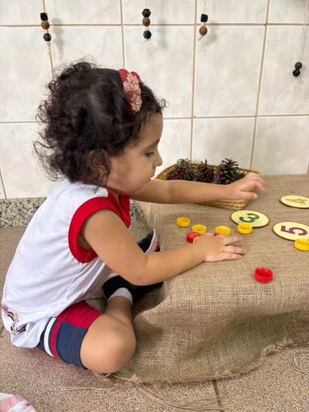 Propostas como as realizadas com cestos, pinhas, tampinhas, pompons, pedras numeradas e potinhos são excelentes exemplos de vivências significativas, pois convidam a criança a manipular, investigar e construir hipóteses. Ao explorar elementos naturais e materiais não estruturados, a criança desenvolve noções matemáticas de forma intuitiva. Por exemplo, ao colocar pompons em recipientes, pode experimentar ideias de “muito” e “pouco”.