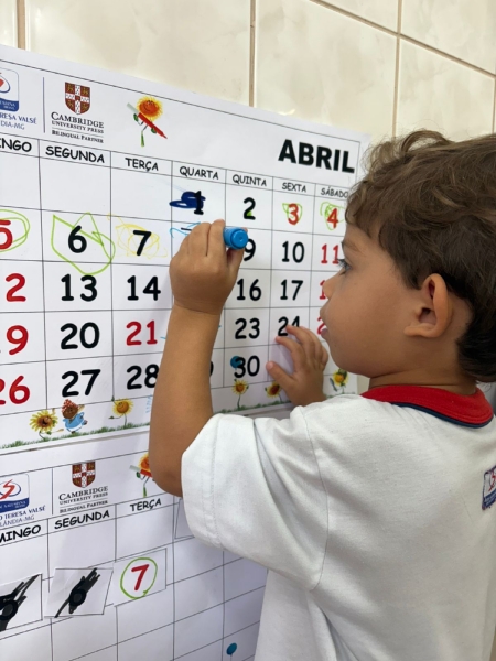 Em nossas rodas de conversa, o uso do calendário também se mostra uma prática potente, mesmo com crianças pequenas. Ainda que não compreendam plenamente a sequência numérica ou o tempo cronológico, elas começam a reconhecer rotinas, antecipar acontecimentos e identificar marcas visuais, como numerais e símbolos.