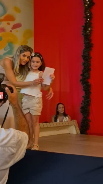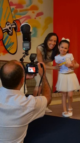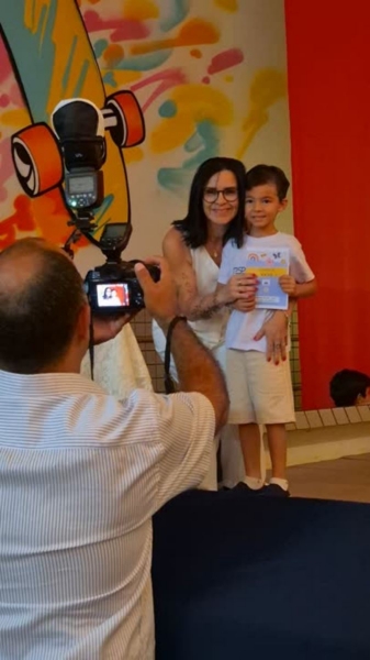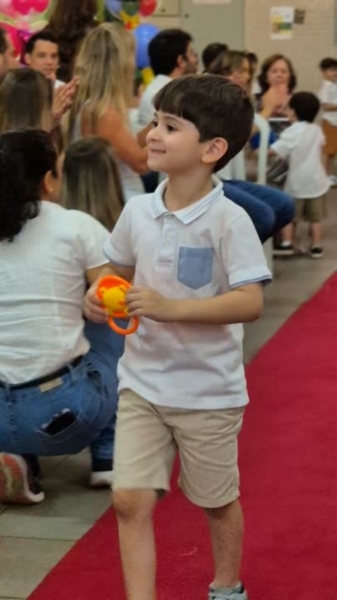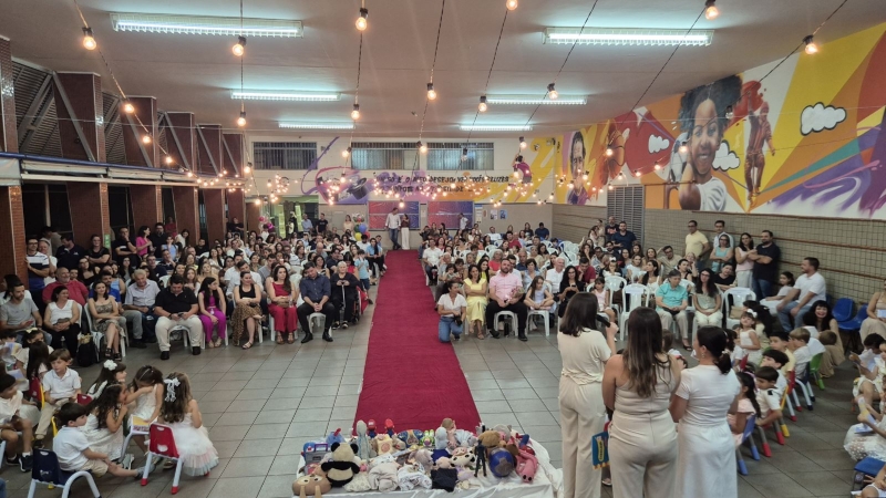 Dando sequência ao momento, as crianças cantaram a música em inglês This Little Light of Mine, que trouxe a mensagem de deixar a luz de Jesus brilhar em cada um de nós. Em seguida, vivenciamos um dos momentos mais simbólicos da noite com a música Sem Perceber, escolhida para representar o tempo que passa, transforma e nos prepara para novos voos. Na sequência, cada criança recebeu seu Caderno de Memórias do Infantil, sendo acolhida pelos aplausos, gestos de orgulho e abraços de suas famílias.