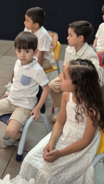 Assistimos juntos a um vídeo preparado com carinho, que retratava a passagem de um prédio para o outro, mostrando o apoio e o cuidado de toda a equipe, professoras, coordenação e crianças. Tivemos também a palavra da diretora pedagógica, Ana Paula Gerino, que trouxe uma reflexão sobre esse período tão importante na vida das crianças, que é a Educação Infantil. A diretora institucional, Irmã Rosa Idalia, falou sobre a bênção que é acompanhar cada etapa da vida dos filhos e, logo após, conduziu um momento especial de oração, no qual as famílias puderam abençoar seus filhos.